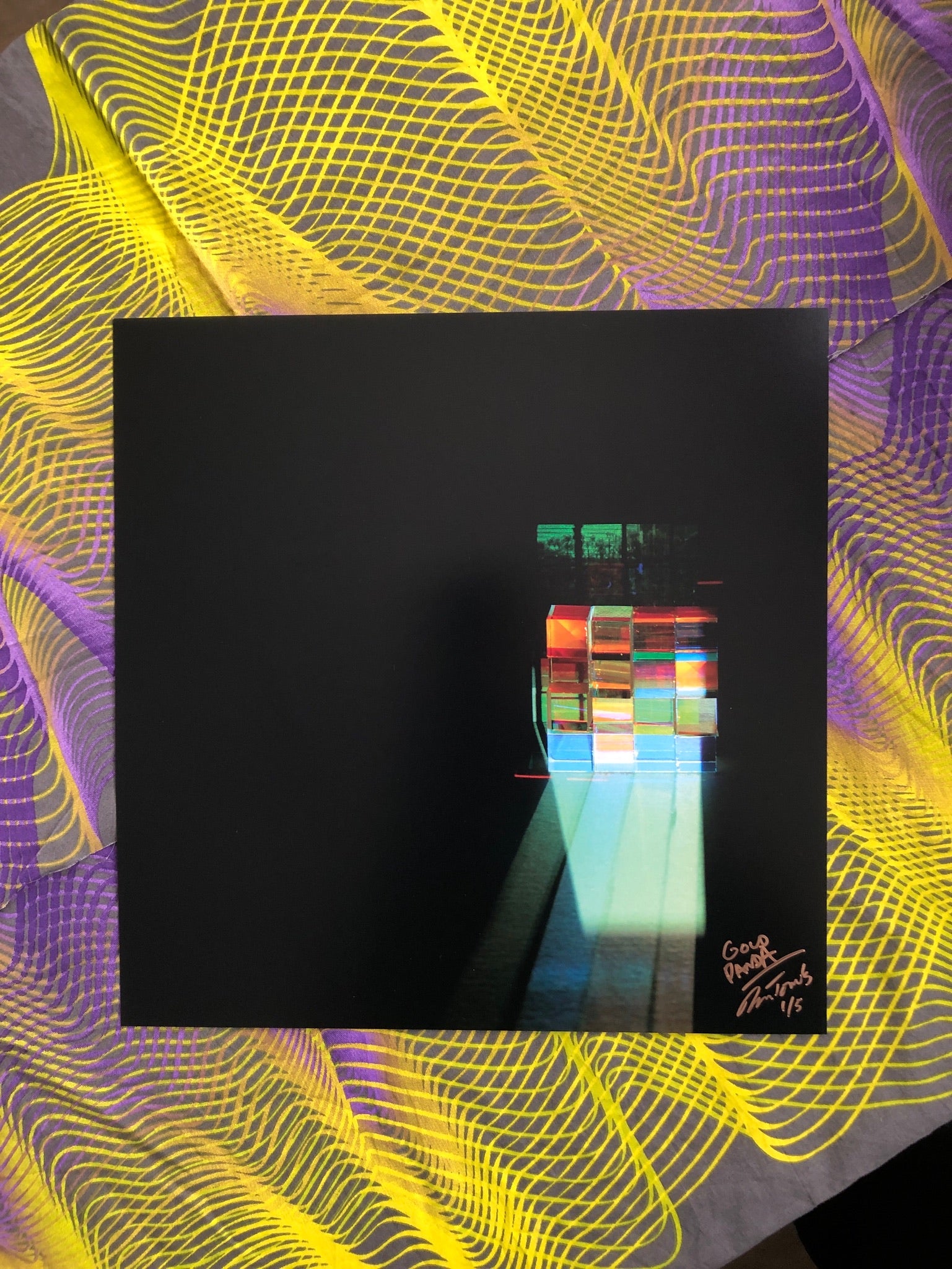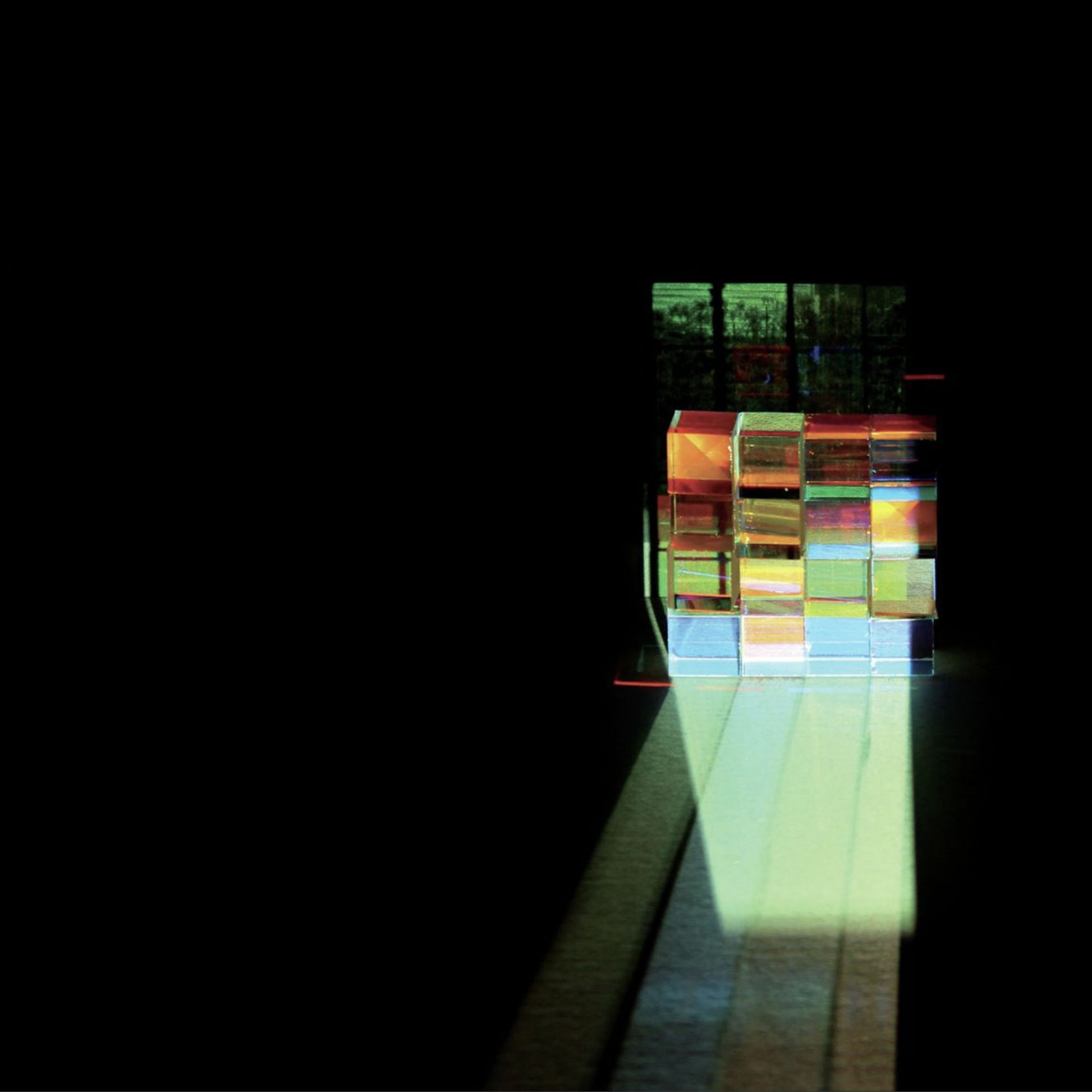 This is a studio shot. The cover image projected through a stack of defective optical glass cubes, intended to echo the layout of the MPC sampler Gold Panda uses on the album.
